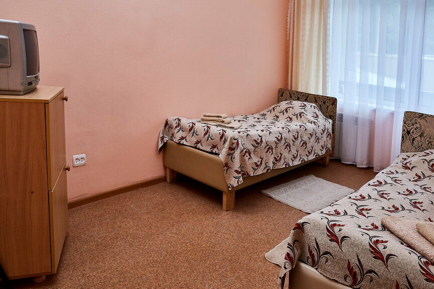 В номере. Односпальные кровати (2,4,7 мест), шкаф, телефон, тумбочки, плазменный телевизор, санузел, душ.